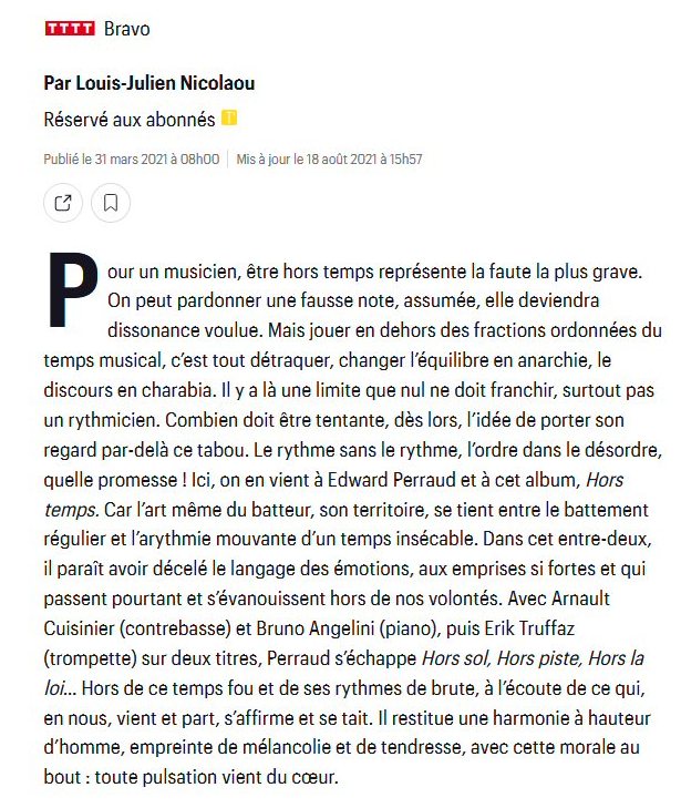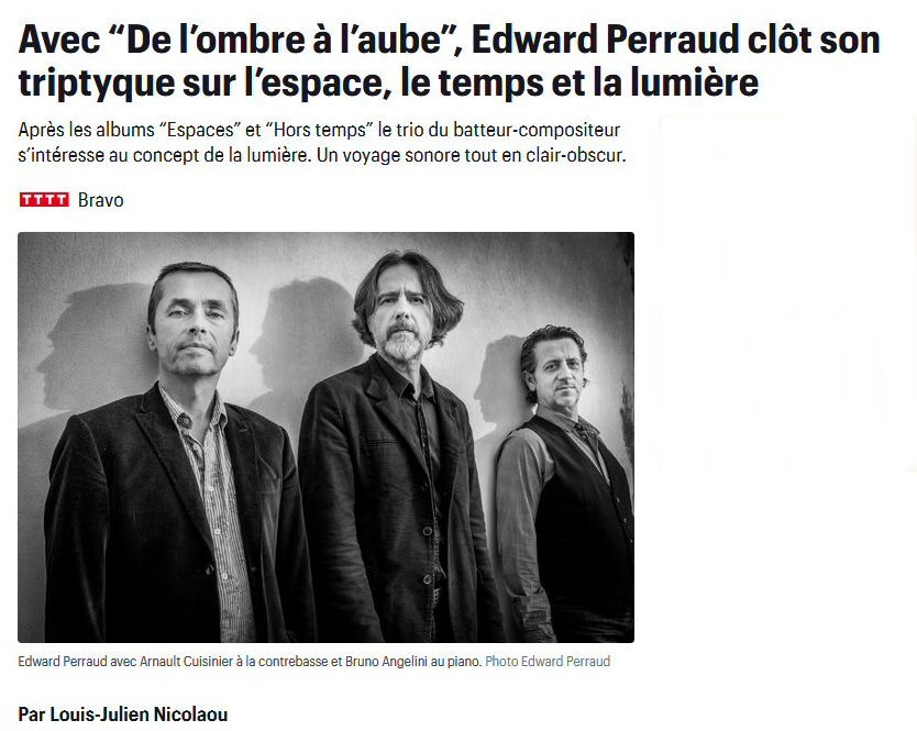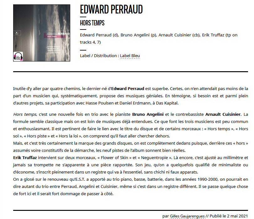 Nous retrouvons avec un réel plaisir Edward Perraud, batteur, percussionniste, compositeur, improvisateur et chercheur. Trois ans après nous avoir crédités de son premier album en trio avec Paul Lay et Bruno Chevillon, il nous revient aujourd’hui, toujours en trio avec le pianiste Bruno Angelini et le contrebassiste Arnault Cuisinier. La formule semble classique mais on est loin de musiques déjà entendues. Le trio est en osmose et réussit à trouver le point d ‘équilibre en mélangeant mélancolie, rêverie et énergie pour nous offrir une série de morceaux qui nous transportent très vite dans une autre dimension, hors temps. Et tel est le titre donné à cet opus d’une incroyable originalité tant par son énergie que par sa retenue, dans une sorte de voyage musical où le temps n’a plus trop d’importance.