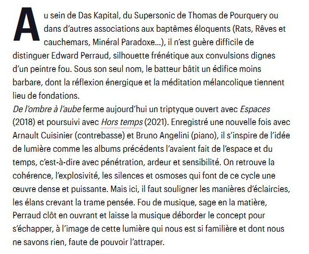 Inutile d’y aller par quatre chemins, le dernier-né d’Edward Perraud est superbe. Certes, on n’en attendait pas moins de la part d’un musicien qui, systématiquement, propose des musiques géniales. En témoigne, si besoin est et parmi plein d’autres projets, sa participation à Das Kapital avec Hasse Poulsen et Daniel Erdmann. Citizen Jazz